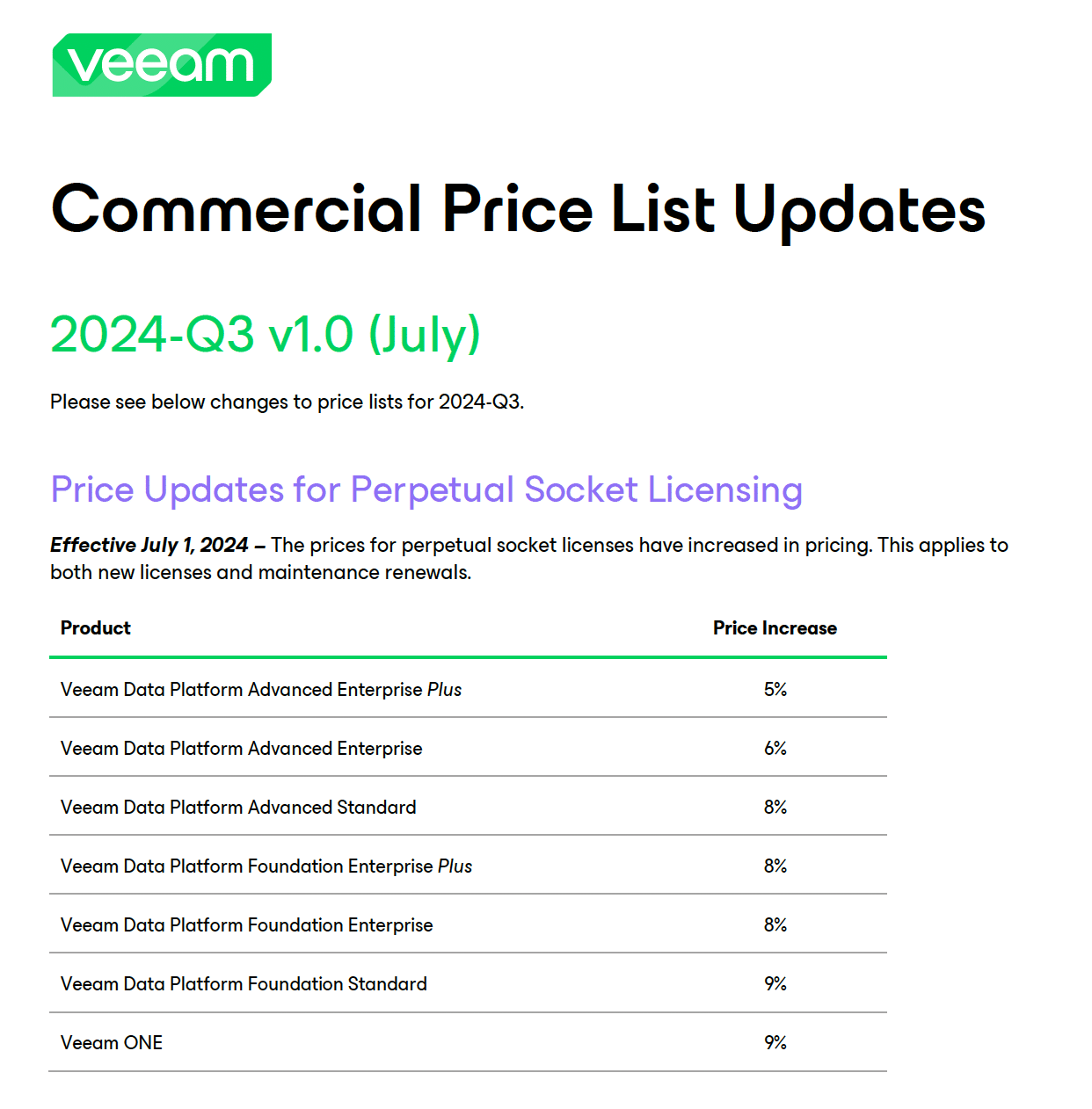 Veeam以CPU計價產品線授權(不論新購/續約)將於7/1進行漲價,漲幅約5-10%,詳細的產品線及其漲幅附於下方